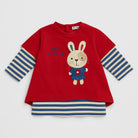 Questo adorabile set di magliette è perfetto per le piccole amiche amanti degli animali! La maglia rossa, realizzata in morbido cotone, presenta un simpatico coniglietto ricamato che strizza l'occhio, mentre la scritta "Das Bitter" aggiunge un tocco di dolcezza. Sotto, una maglia a righe blu e grigio, con maniche lunghe, offre calore e comfort per le giornate più fresche. Il suo stile stratificato rende ogni outfit unico e giocoso, ideale per un look chic e informale. Nonostante sia un capo usato, è in ottime condizioni e pronto a far divertire la tua piccola!