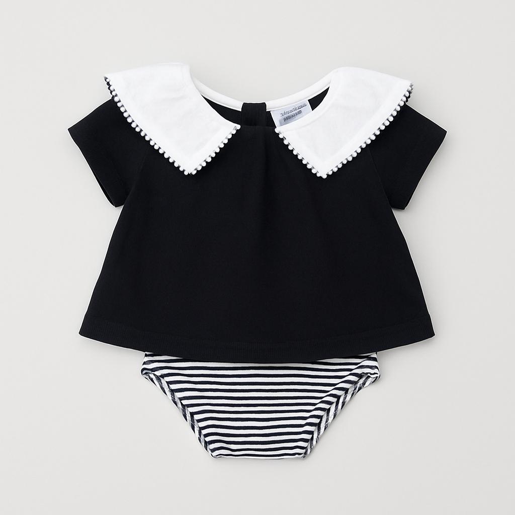 Questo adorabile completino per neonati è perfetto per le piccole stelle! Realizzato in morbido cotone, presenta una maglietta nera con un delizioso colletto bianco e un tenero ricamo di un pinguino che porta un berretto rosso. È abbinato a una graziosa mutandina a righe, che aggiunge un tocco di gioco e vivacità. Comodo e leggero, è ideale per le giornate estive e le avventure in famiglia. Nonostante sia un capo usato, è in ottime condizioni, pronto a far sorridere chi lo indossa! Un must-have per le piccole fashioniste!