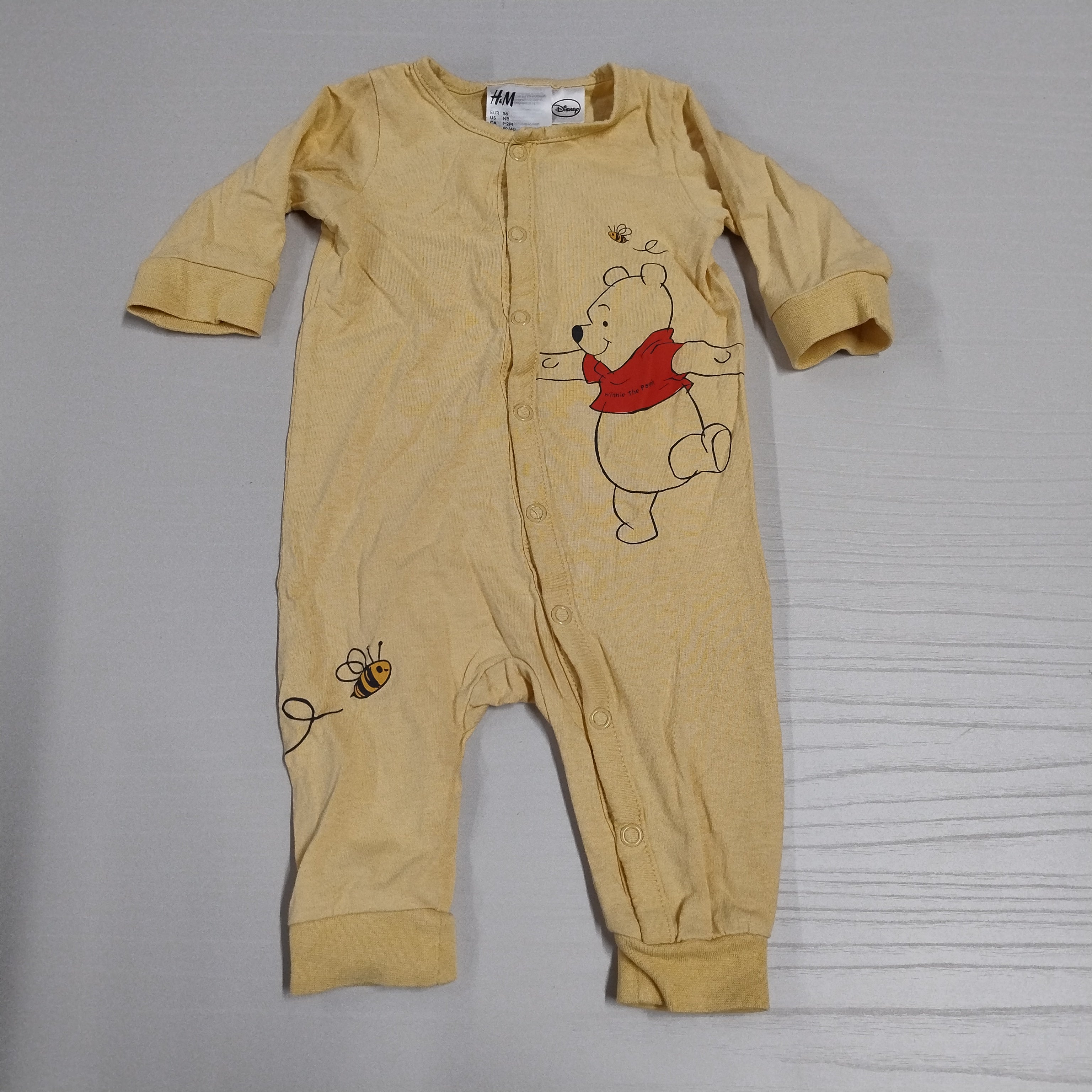Questo adorabile pigiama intero di H&M è un vero sogno per i più piccoli! Realizzato in un morbido cotone giallo, presenta un grazioso motivo di Winnie Pooh che gioca spensierato. I bottoni frontali facilitano il momento del cambio, mentre le maniche lunghe e i polsini assicurano comfort e calore durante le notti. Un pezzo usato ma in buone condizioni, perfetto per fare addormentare il tuo bimbo in grande stile! Un vero must per le notti di coccole e sogni d'oro!