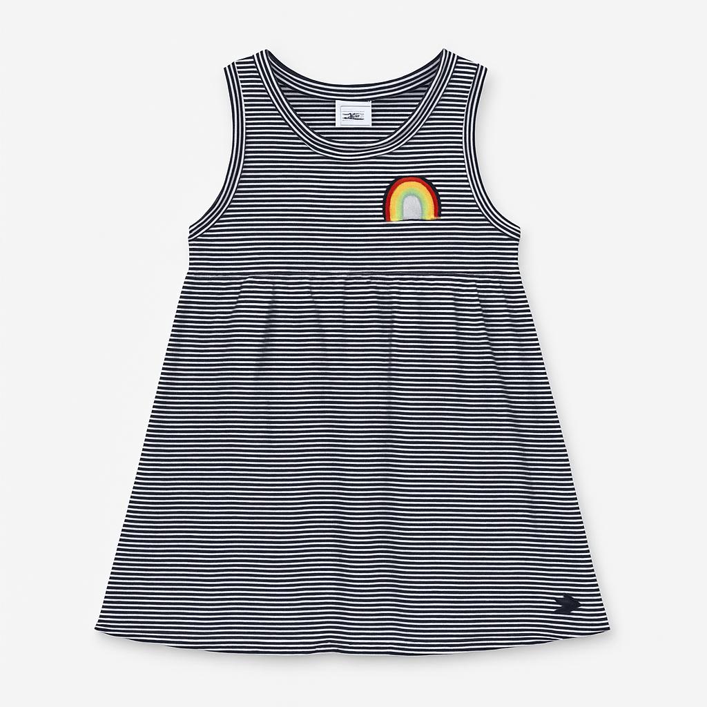 Questo adorabile vestitino a righe è perfetto per le piccole sognatrici! Realizzato in morbido cotone, presenta una simpatica applicazione di arcobaleno sul petto, che aggiunge un tocco di colore e gioia. Con le sue maniche senza spalline e il taglio ampio, è ideale per le calde giornate estive e per le avventure all'aperto. Nonostante sia un capo usato, si trova in ottime condizioni, pronto per essere indossato da una piccola esploratrice. Un must-have per un look fresco e giocoso!