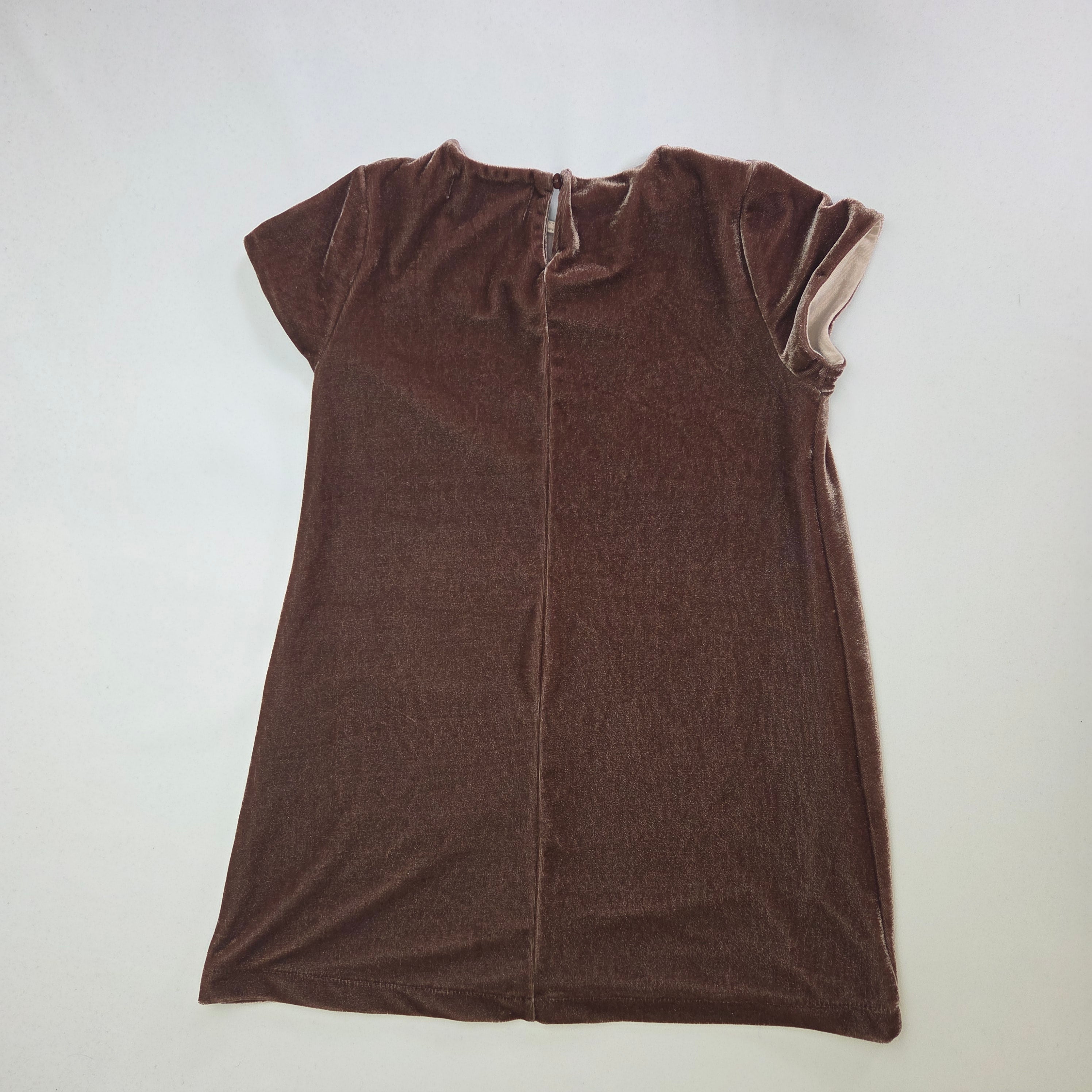 Questa adorabile vestitino in velluto marrone è perfetto per la tua piccola principessa! Con una texture morbida e leggermente lucida, il vestito è impreziosito da scintillanti dettagli in strass che brillano come stelle. Le maniche corte e il taglio sciolto garantiscono comfort e libertà di movimento, rendendolo ideale per feste, occasioni speciali o semplicemente per giocare con stile. Anche se usato, è in ottime condizioni e pronto a far brillare il suo guardaroba. Un capo chic e versatile che ogni bambina amerà indossare!