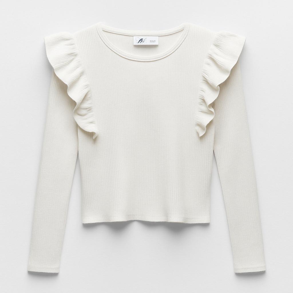 Questa deliziosa maglietta a maniche lunghe è perfetta per le piccole che amano esprimere il loro stile! Realizzata in un morbido tessuto a coste, il suo colore neutro la rende facile da abbinare a qualsiasi pantalone o gonna. Le maniche con volant aggiungono un tocco di femminilità e sono ideali per giochi e avventure. Nonostante sia un capo usato, si presenta in ottime condizioni, pronta per nuove giornate di divertimento. Questa maglietta è una scelta adorabile per ogni giovane trendsetter!