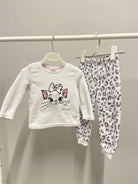 Preparati a coccolare la tua piccola con questo adorabile pigiama! La maglietta in morbido pile bianco è decorata con un dolce motivo di Marie, la micetta elegante, che aggiunge un tocco di tenerezza. I pantaloni, con morbido elastico in vita, presentano un vivace motivo a macchie colorate su base bianca, perfetto per le notti di gioco e sogni d'oro. Questo set è ideale per assicurare comfort e stile durante il riposo. Nonostante sia un prodotto usato, si presenta in ottime condizioni e porterà un sorriso sul viso della tua futura stilista!