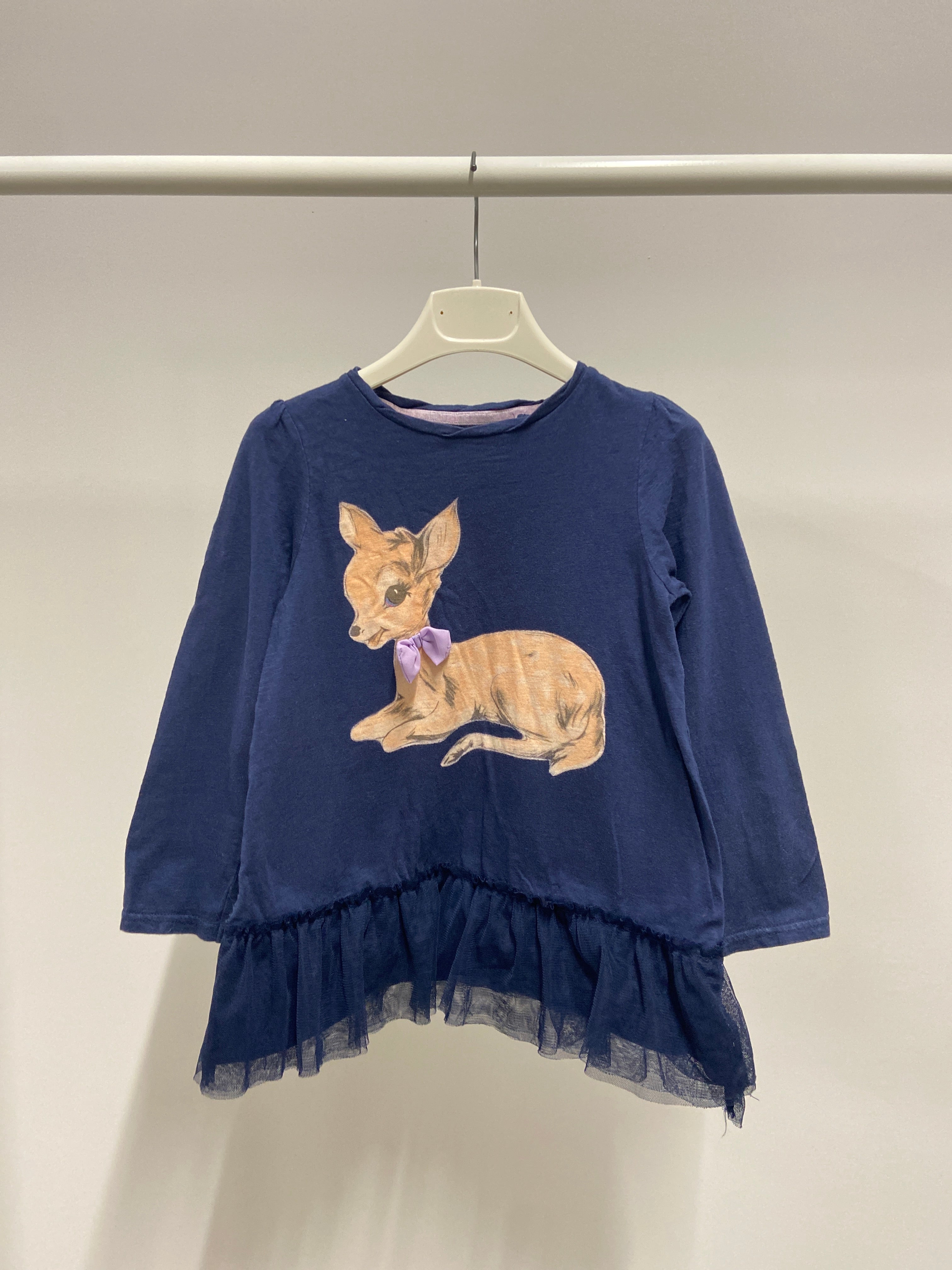 Questo adorabile maglione per bambina è un vero gioiellino da aggiungere al guardaroba! Realizzato in morbido cotone, presenta un delicato colore blu notte che si abbina facilmente a qualsiasi outfit. La graziosa stampa di un cerbiatto con un fiocco rende il capo ancora più speciale e affettuoso.
