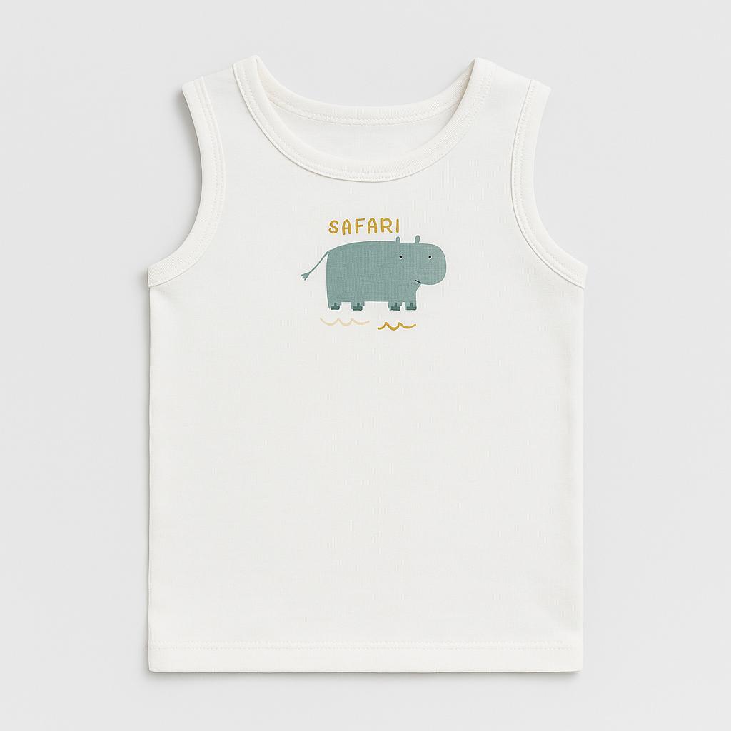 Questa deliziosa canotta bianca di marca Frugoo è il capo perfetto per i piccoli amanti dell'avventura! Realizzata in morbido cotone, offre comfort e freschezza. Il suo design presenta un simpatico ippopotamo stampato con la scritta “Safari”, che aggiunge un tocco giocoso e originale. Le spalline sottili e il taglio leggero la rendono ideale per le calde giornate estive. Anche se usata, si presenta in ottime condizioni, pronta ad accompagnare le giornate di giochi e divertimento all'aperto. Un must-have per ogni piccolo esploratore!