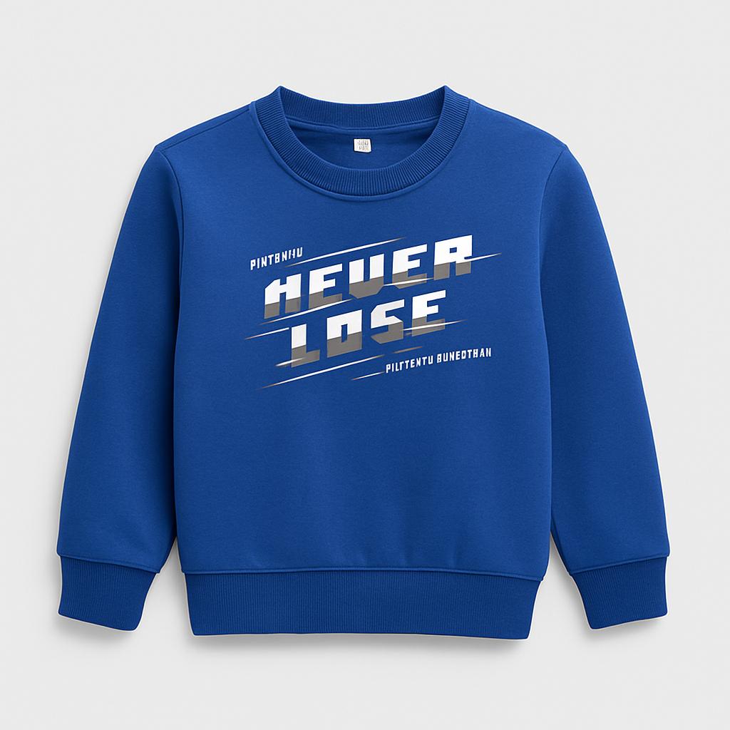 Questa maglia a maniche lunghe di colore blu elettrico è perfetta per i piccoli amanti del comfort e dello stile! Realizzata in un morbido tessuto, offre calore e versatilità per ogni avventura. Sul fronte, l'audace scritta “NEVER GIVE UP” in lettere grafiche rende il design vivace e accattivante, ispirando tutti a seguire i propri sogni.