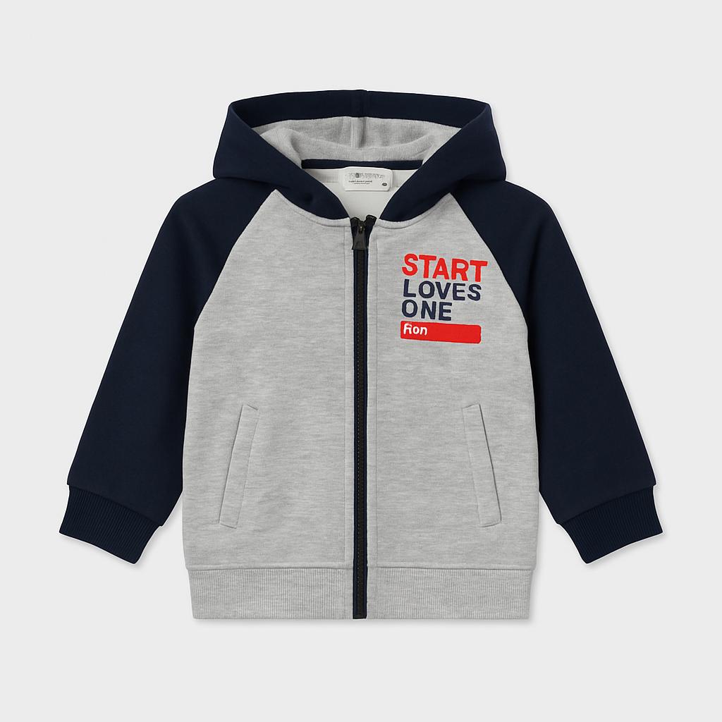 Questo adorabile zip-up grigio con cappuccio è perfetto per le piccole avventure! Realizzato in morbido cotone, offre comfort e calore nelle fresche giornate primaverili. Le maniche a contrasto in blu navy e il vivace logo "START LEVEL ONE" sul petto aggiungono un tocco di stile e originalità. Facile da indossare grazie alla chiusura con zip, è ideale per giocare all'aperto o per outfit casual. Nonostante sia un capo usato, si presenta in ottime condizioni ed è pronto a regalare divertimento e style al tuo piccolo!