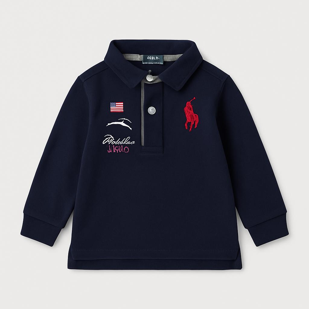 Questa maglietta a maniche lunghe di Ralph Lauren è un vero gioiellino per il guardaroba dei più piccoli! Realizzata in un morbido cotone blu navy, presenta un colletto alla marinara e dettagli ricamati che le conferiscono un tocco elegante e casual. La piccola bandiera americana e il logo del brand sul petto rendono questo capo unico e di stile, perfetto per le giornate fresche o le occasioni speciali. Nonostante sia usata, si presenta in ottime condizioni e pronta per accompagnare le avventure dei tuoi piccoli! Un'ottima scelta per chi ama un look sofisticato e comodo!