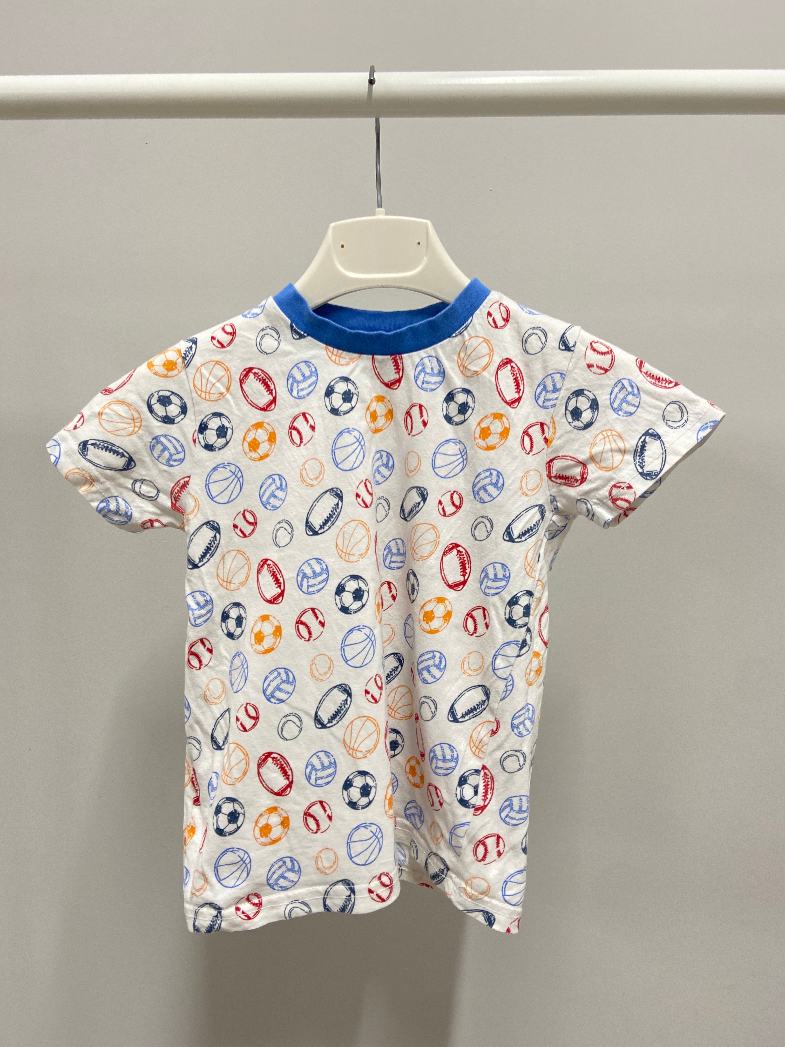 Questa vivace t-shirt è perfetta per i piccoli sportivi! Realizzata in morbido cotone, la maglietta presenta un divertente motivo che unisce palloni da calcio, basket e altri sport, stimolando l'immaginazione dei bambini. Il colletto blu aggiunge un tocco frizzante, mentre il taglio comodo la rende ideale per ogni avventura. Nonostante sia un capo usato, si presenta in ottime condizioni, pronto per accompagnare il tuo piccolo in mille gioco e divertimenti quotidiani! Un must-have per i piccoli atleti!