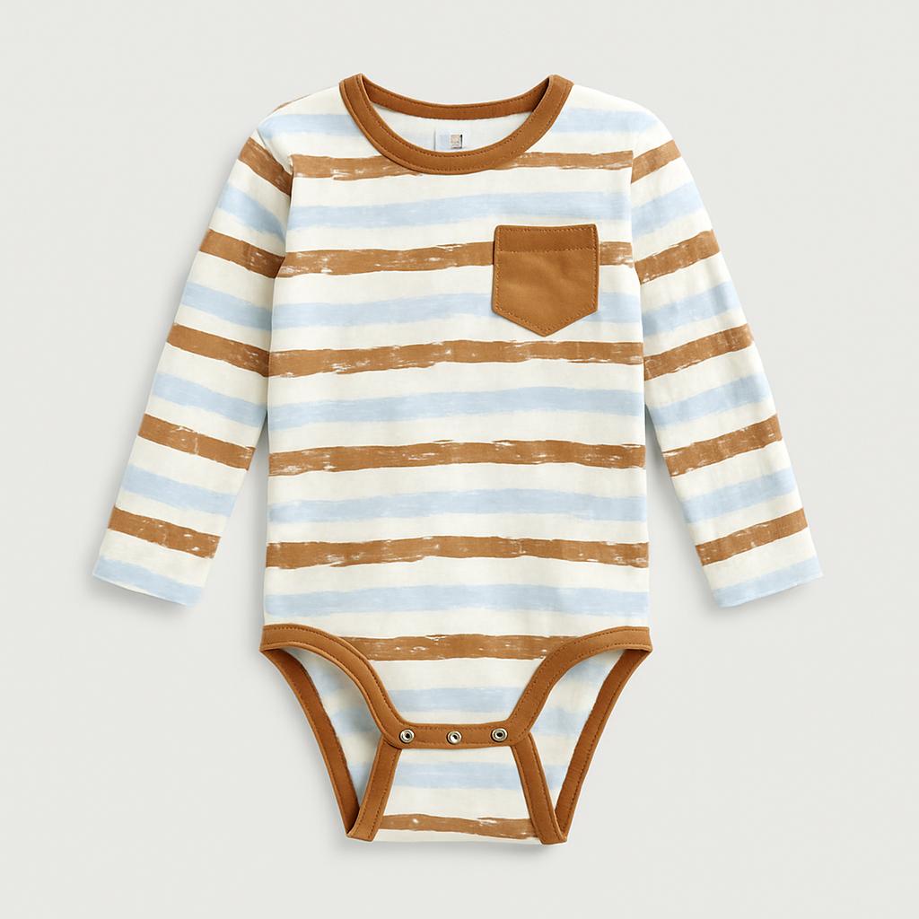 Questo adorabile body a maniche lunghe è perfetto per i piccoli esploratori! Con una fantasia a righe bianche e azzurre alternate a tocchi di marrone, aggiunge un tocco di freschezza al guardaroba. Il pratico taschino frontale è un dettaglio grazioso, mentre il morbido cotone assicura comfort durante tutto il giorno. I bottoncini alla base rendono i cambi facili e veloci. Nonostante sia un capo usato, è in buone condizioni e pronto per nuove avventure! Un'ottima scelta per i neomamme che cercano qualità e stile!
