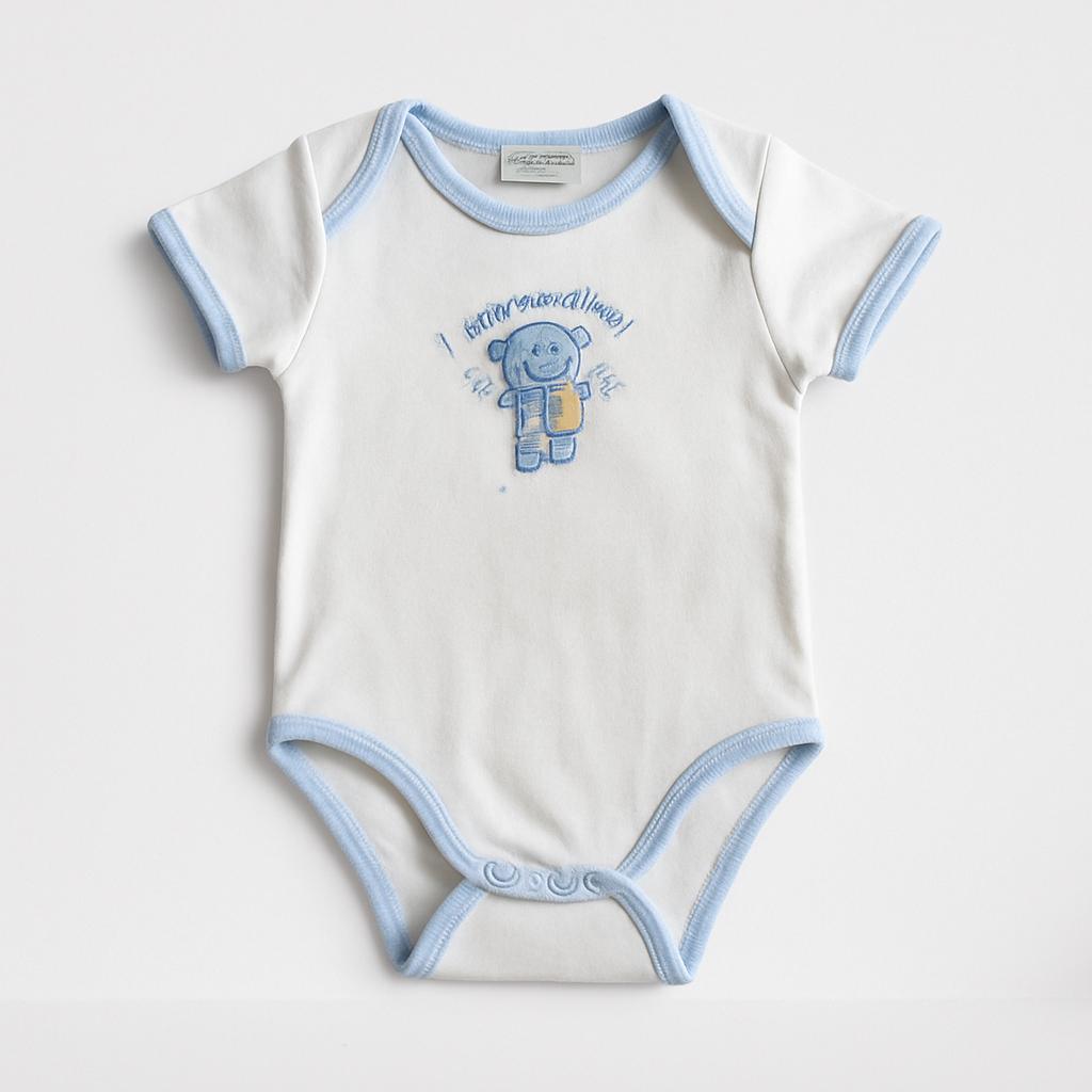 Questo adorabile body per neonati è un vero passpartout per il guardaroba dei più piccoli! Realizzato in morbido cotone, offre comfort e freschezza nelle calde giornate. La delicata tonalità bianca con dettagli azzurri rende il capo dolce e raffinato. Sul fronte, una simpatica illustrazione che celebra il mondo dell'infanzia, aggiunge un tocco di allegria e tenerezza. Le pratiche aperture a scatto sul fondo facilitano il cambio del pannolino, rendendo questo body non solo stiloso ma anche estremamente funzionale. Un capo usato ma in buone condizioni, perfetto per ogni piccola meraviglia!