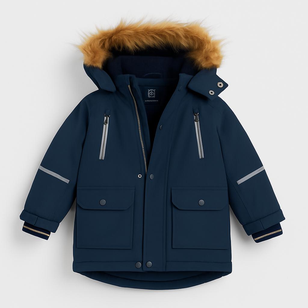 Questo meraviglioso giubbotto invernale di marca è perfetto per tenere al caldo i piccoli durante le giornate fredde! Realizzato in un resistente tessuto blu scuro, presenta dettagli in contrasto e una morbida pelliccia sintetica sul cappuccio, che aggiunge un tocco di stile e coccole. Le tasche frontali e le zip laterali non solo sono pratiche ma rendono il design ancora più accattivante.