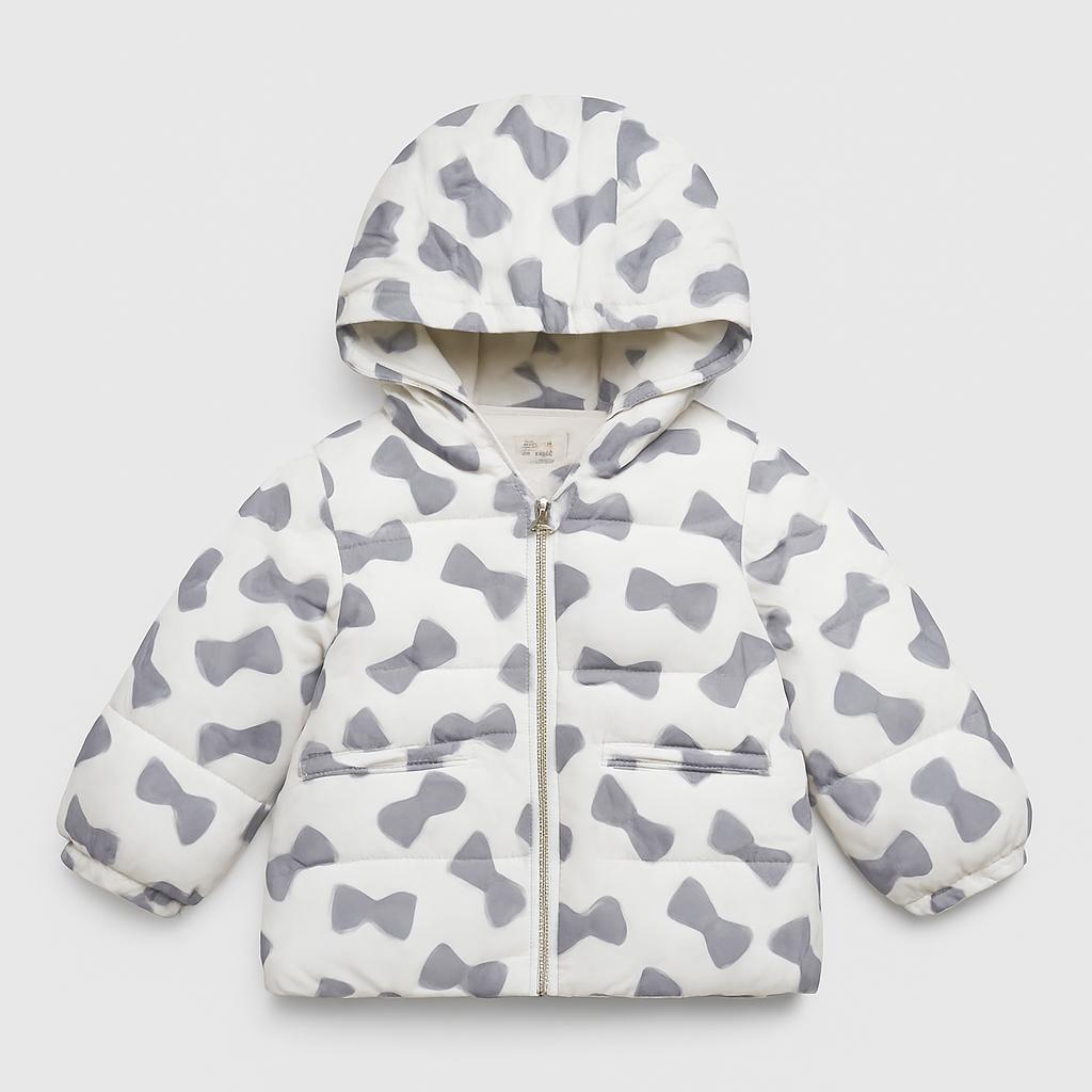 Questo delizioso giubbotto bianco con simpatici fiocchi grigi è perfetto per rendere i giorni freschi più allegri e stilosi! Realizzato in morbido materiale imbottito, offre calore e comfort per le piccole avventuriere. La chiusura con zip e i pratici taschini frontali sono ideali per riporre piccoli tesori. La cappuccio regolabile aggiunge un tocco di versatilità e protegge dalle intemperie. Nonostante sia un capo usato, è in ottime condizioni e pronto per accompagnare la tua piccola in ogni avventura! Un must-have per un guardaroba vivace e funzionale!