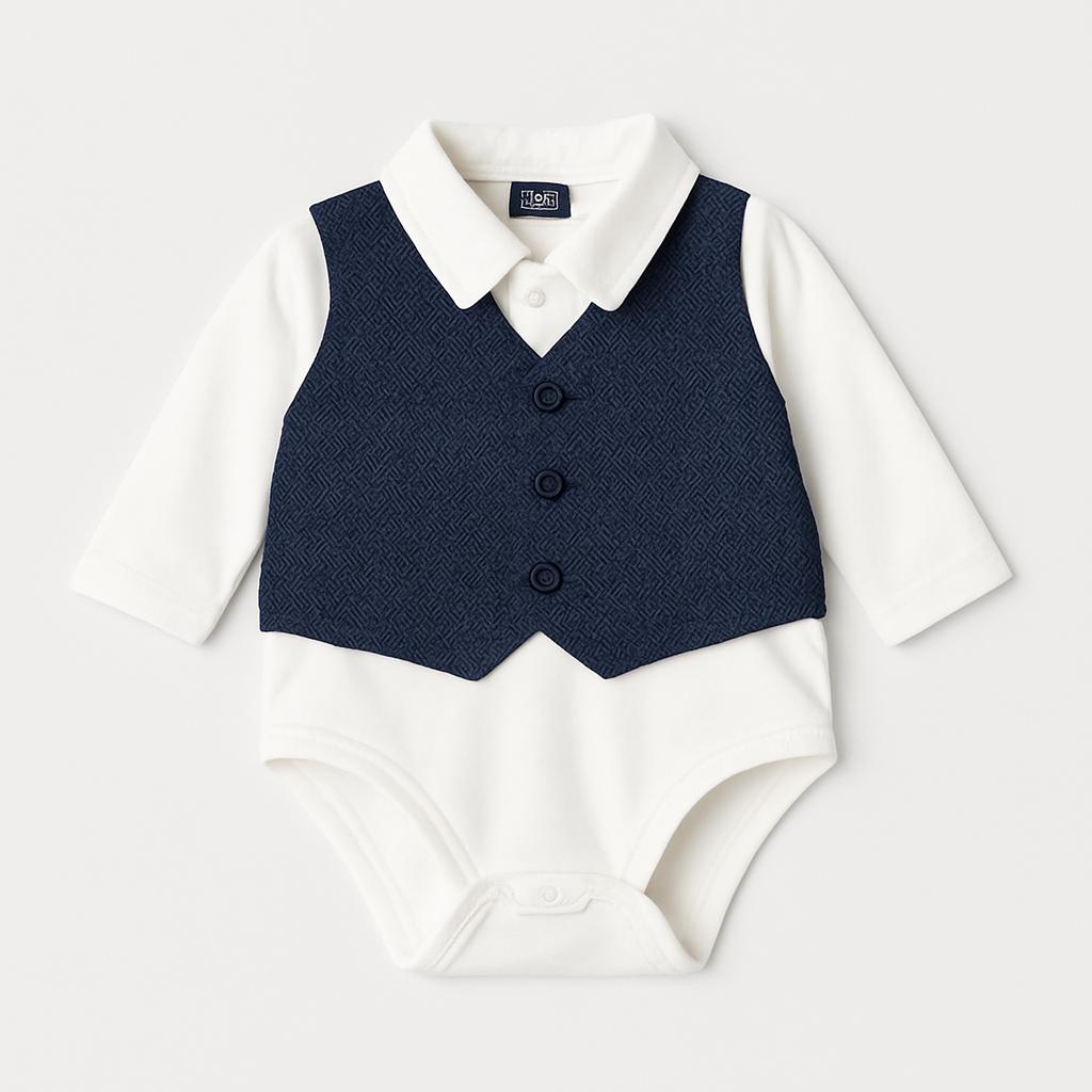This adorable baby bodysuit combines comfort and style, making any occasion special! Featuring a stylish blue zigzag vest and a white shirt, it's perfect for weddings or parties. The buttons down the front add a chic touch, while the soft fabric ensures your little one is always comfortable. Despite being used, it's in excellent condition and ready to dress your little one with elegance and practicality. A must-have for little gentlemen!