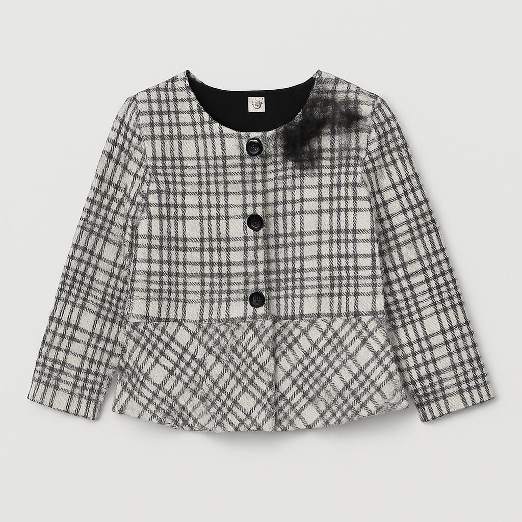 Questo incantevole giacchino a quadri è un'aggiunta perfetta per il guardaroba delle piccole trendsetter! Realizzato in un caldo tessuto, presenta una stampa a quadri in bianco e nero che conferisce un tocco elegante e raffinato. Le maniche lunghe e il taglio peplum daranno un'aria chic a ogni outfit, mentre i bottoni neri sul davanti aggiungono un punto di contrasto accattivante.