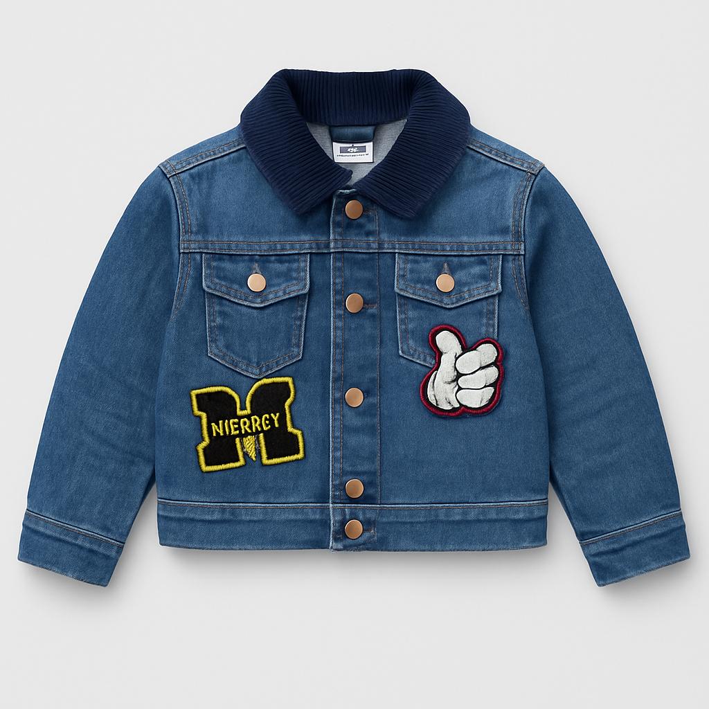 Questo giubbottino in denim per bambini è un vero must-have per ogni piccolo esploratore! Dotato di una colletto in morbido corduroy, aggiunge un tocco distintivo al classico jeans. Le patch colorate, tra cui un divertente pollice in su e un logo stilizzato, creano un look allegro e originale. Il taglio corto e trendy rende questo capo perfetto per ogni outfit, da un giro nel parco a un'uscita con gli amici. Nonostante sia usato, si presenta in ottime condizioni, pronto a portare colore e stile nel guardaroba del tuo bambino!