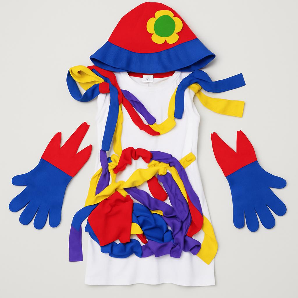 Questo costume colorato da clown è perfetto per i piccoli amanti della fantasia! Realizzato in tessuto leggero e morbido, è caratterizzato da un divertente cappello rosso con un fiore giallo e bande colorate di vari toni. La parte principale è una tunica bianca decorata con nastri di colori vivaci come blu, giallo e viola, che si attaccano facilmente, offrendo un look giocoso e creativo. Ideale per feste, giochi di ruolo o carnevali, questo costume farà felici tutti i bambini che amano divertirsi e fare spettacolo! Anche se usato, è in buone condizioni, pronto per una nuova avventura!