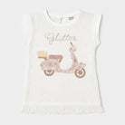 Questa incantevole t-shirt bianca è perfetta per le piccole sognatrici che amano lo stile! Realizzata in morbido cotone, presenta un delizioso motivo glitterato con una scooter rosa decorato da fiori. Le maniche corte e il taglio leggermente sfilato offrono comfort e freschezza, rendendola ideale per le giornate estive. La t-shirt, pur essendo usata, è in ottime condizioni e pronta per un nuovo viaggio nel mondo della moda infantile. Aggiungi un tocco di brillantezza al guardaroba della tua bimba!