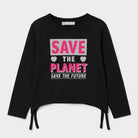 Questa t-shirt a maniche lunghe, di un elegante colore nero, è perfetta per le piccole eco-eroine! Con una fantastica scritta "SAVE THE PLANET" in colori vivaci e brillanti, trasmette un messaggio positivo per il futuro. Il taglio originale con dettagli laterali rende questo capo unico e alla moda. Realizzata in morbido cotone, garantisce comfort e leggerezza, ideali per le avventure quotidiane. Anche se usata, si presenta in ottime condizioni, pronta per essere indossata da chi ama lo stile e la sostenibilità!