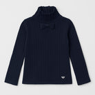 This elegant dark blue sweater is the perfect addition to your little one's wardrobe! Crafted from a soft ribbed knit, it offers warmth and comfort on cool days. The high collar and cute bow on the front add a touch of sophistication and chic, perfect for special occasions or a more sophisticated look. The long sleeves ensure comfort, while the simple design pairs easily with pants or skirts. Despite being pre-owned, it's in good condition and ready for any little trendsetter to wear!