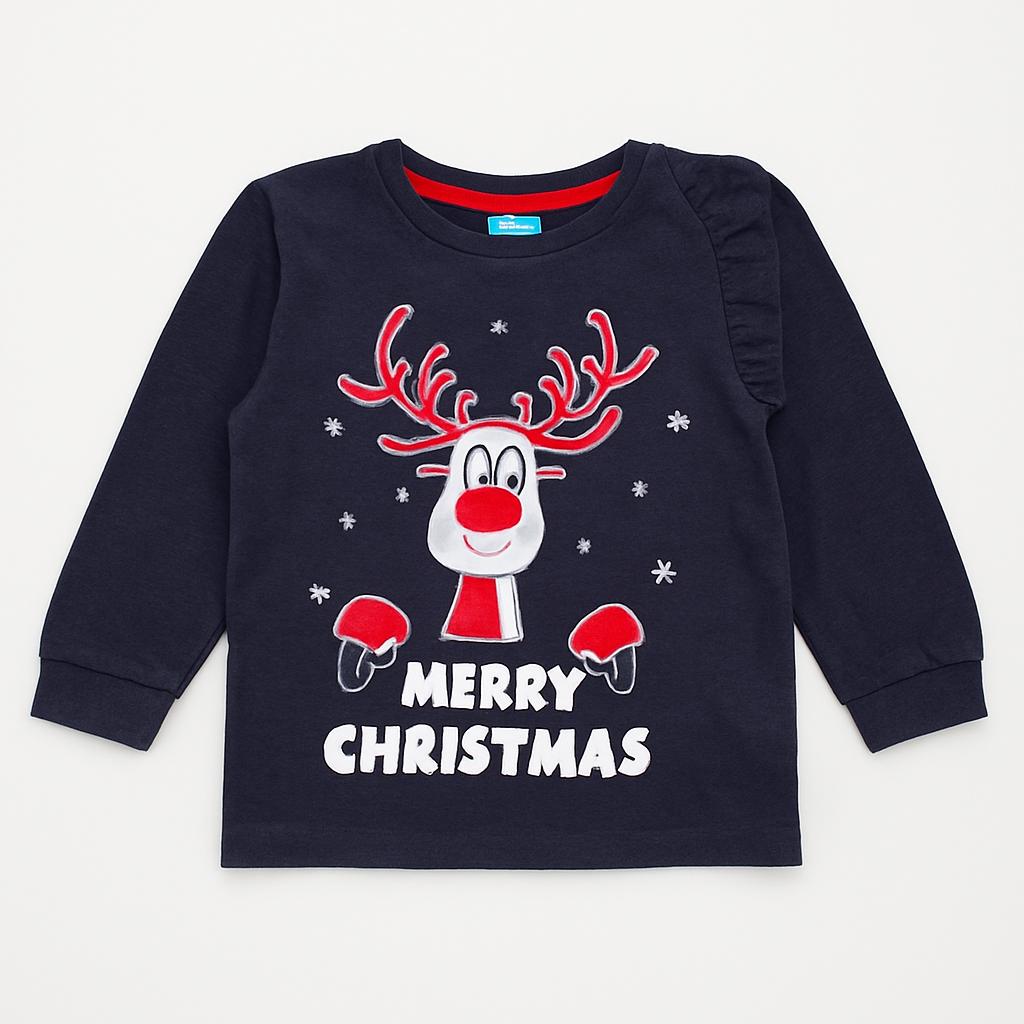 Questa adorabile maglietta a maniche lunghe è perfetta per il periodo natalizio! Realizzata in cotone morbido, presenta un delizioso design con un simpatico renna che augura un "Merry Christmas". Il fondo blu scuro mette in risalto il festoso motivo, mentre i dettagli arricciati sulle spalle aggiungono un tocco di charme. Ideale per le giornate invernali e le feste in famiglia, questa maglietta usata è in buone condizioni e rappresenta un ottimo modo per far sentire il tuo piccolo speciale durante le festività!