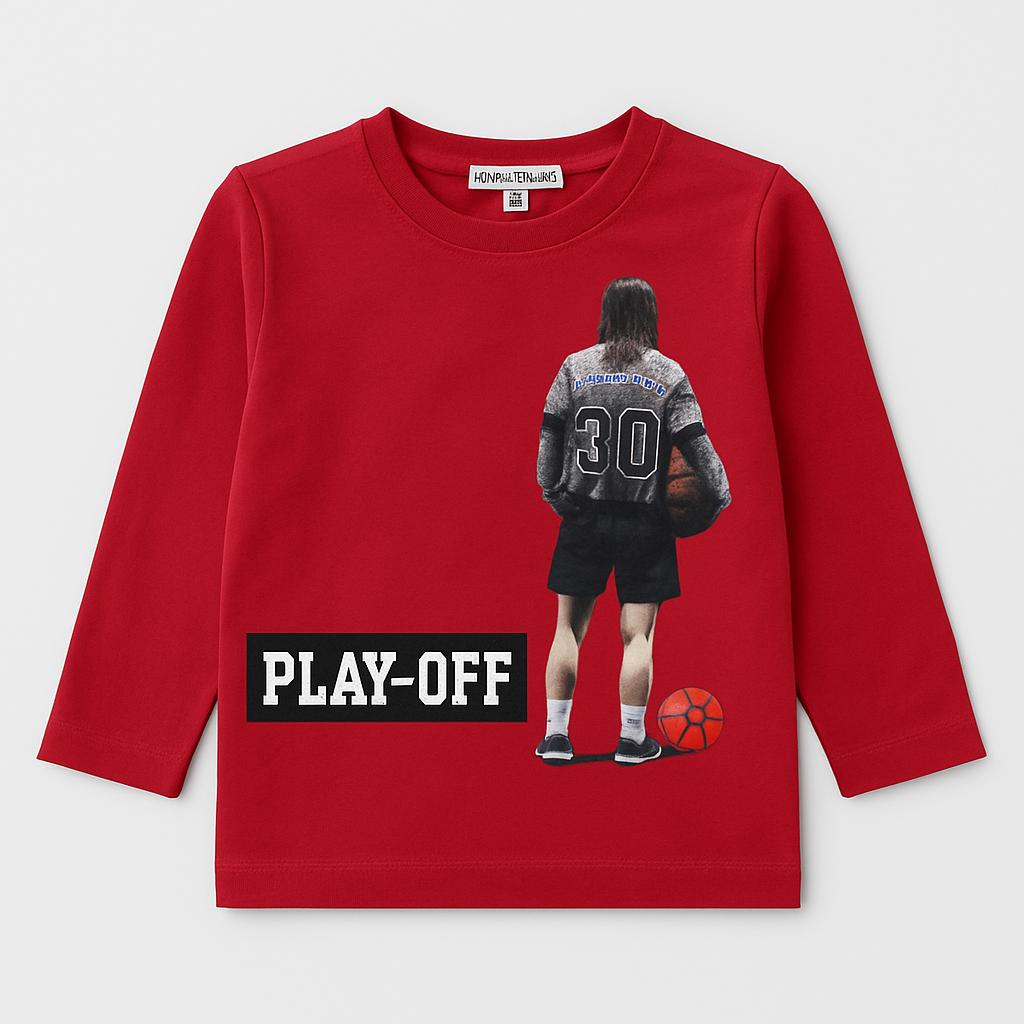 Questa t-shirt a maniche lunghe rossa di marca American è perfetta per i piccoli amanti del basket! Con un design accattivante che ritrae un giovane giocatore pronto per la partita, renderà ogni giorno un'avventura sportiva. La scritta "PLAY-OFF" aggiunge un tocco di grinta, mentre il cotone morbido assicura comfort durante ogni attività. Ideale per le fresche giornate autunnali o per la scuola, questo capo usato è in ottime condizioni e parte essenziale di un guardaroba dinamico e trendy!