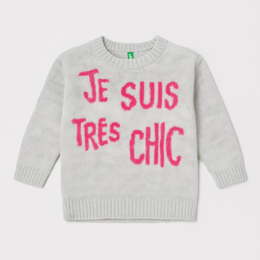 Questo adorabile maglione grigio, perfetto per le piccole fashioniste, è impreziosito da un vivace messaggio “Je suis très chic” in un rosa brillante. Realizzato in un morbido filato, offre comfort e calore, ideale per i giorni freschi. Le maniche lunghe e il taglio leggermente ampio lo rendono versatile e stylish, perfetto da abbinare a jeans o gonne. Nonostante sia un capo usato, si presenta in ottime condizioni e porterà un tocco di eleganza e originalità nel guardaroba della tua piccola! Un must-have per ogni piccolo amante della moda!