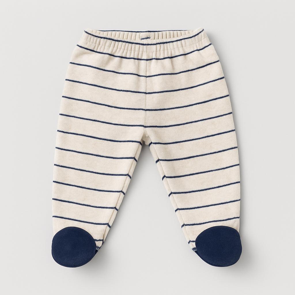 These adorable children's pants, featuring a soft fleece fabric, are ideal for keeping your little one warm on cooler days. Featuring a delicate beige and blue striped pattern, the pants offer a simple yet stylish look. The elastic waistband ensures a comfortable fit, while the closed cuffs make them practical and prevent cold feet. Despite being used, they are in excellent condition, ready for any adventure. Perfect for relaxing at home or for walks outdoors!