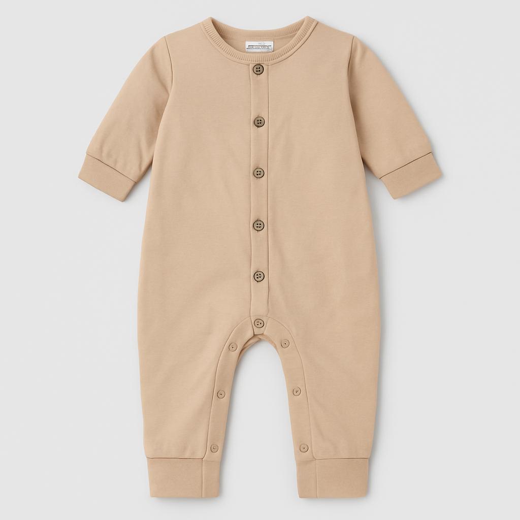 Discover this adorable beige long onesie, perfect for little ones to cuddle! Made from soft cotton, it offers comfort and warmth on cooler days. The front button closure makes changing easy, while the simple yet elegant design makes it versatile for any occasion. Despite being used, it's in excellent condition and ready to accompany your little one on new adventures. A must-have for a comfortable and fashionable look!