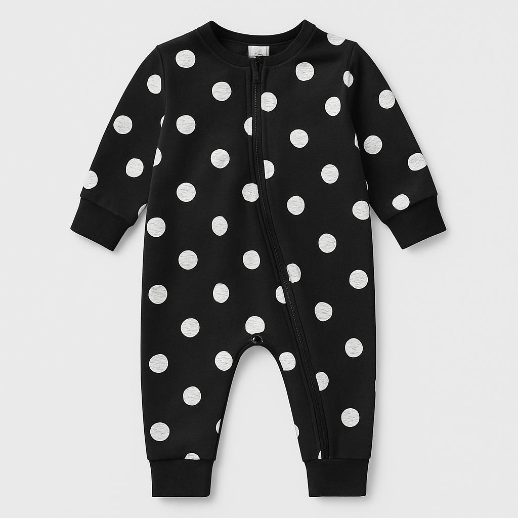 This adorable baby onesie is a must-have for every little one! Made from soft black cotton, it's decorated with cute white polka dots for a playful and vibrant touch. The front zip closure makes it practical and easy to wear, while the long sleeves make it perfect for cool summer evenings. Despite being used, it's in good condition, ready to accompany your little one on their daily adventures. Comfortable and stylish, this onesie is ideal for free play and always feeling great!