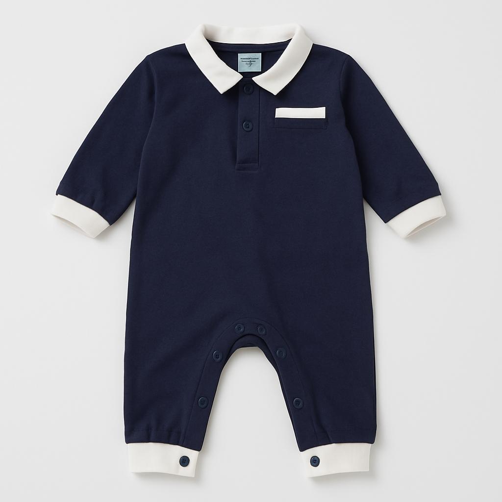 This adorable, solid navy blue long onesie is a must-have for little princes! Crafted from a soft fabric, it offers comfort and warmth on cool days. The elegant collar and front pocket add a touch of class, making it perfect for any occasion, from a family gathering to a stroll in the park. Practical snaps make changing easy, while white cuffs add a subtle contrast. Despite being pre-owned, it's in excellent condition, ready for a new adventurer! A dress that combines style and practicality!