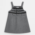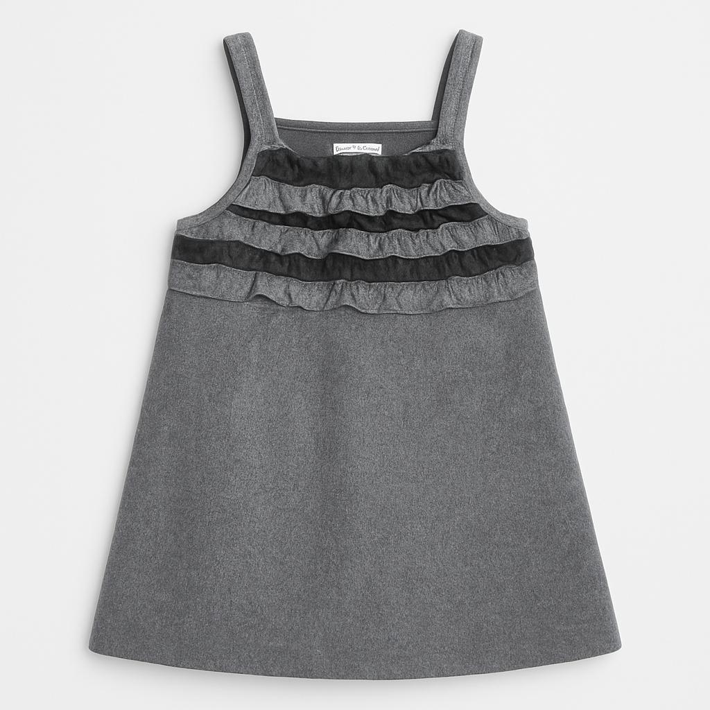 Questo elegante vestito grigio è un vero e proprio pezzo versatile per il guardaroba della tua piccola! Realizzato in un morbido tessuto, presenta spalline sottili e un adorabile dettaglio di ruches nere che aggiunge un tocco di raffinatezza. La silhouette semplice e pulita rende questo abito perfetto per occasioni speciali o per un look da giorno chic. Anche se è un capo usato, si presenta in ottime condizioni, pronto a far brillare ogni outfit. Un must-have per le piccole che amano sentirsi eleganti e alla moda!