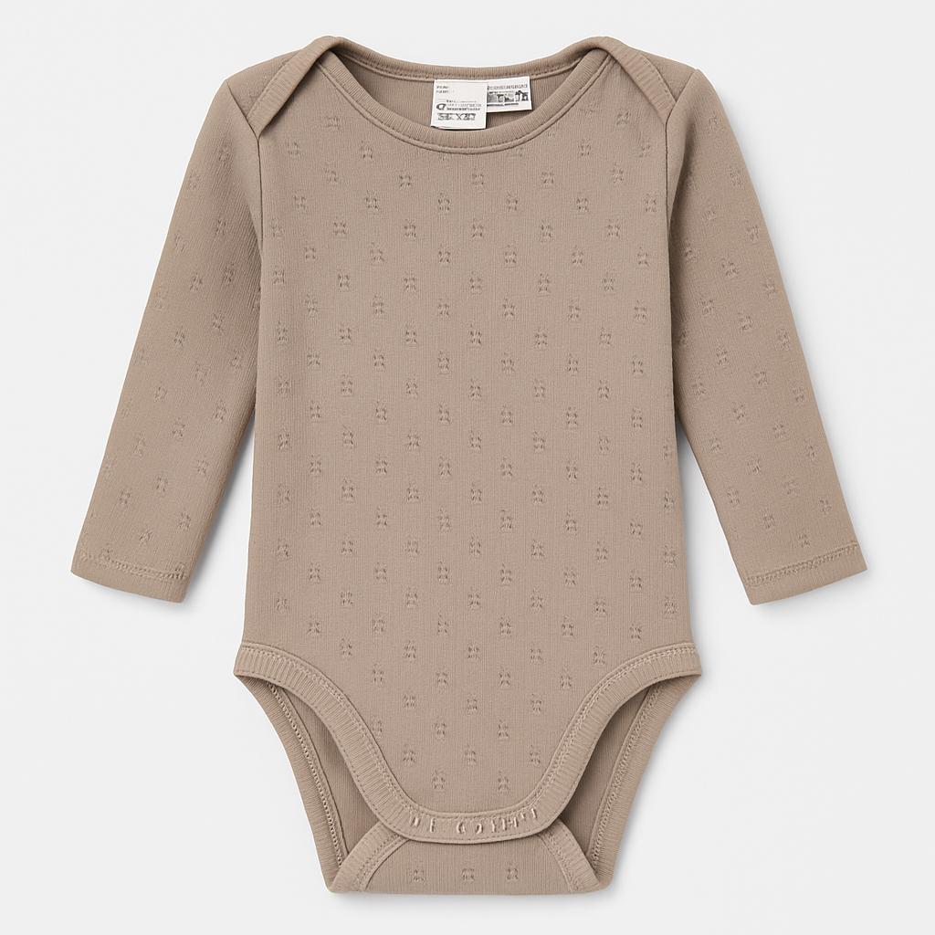 Questo adorabile body a maniche lunghe è un capo essenziale per il guardaroba del tuo piccolo! Realizzato in un morbido tessuto di cotone, presenta una delicata trama che aggiunge un tocco di eleganza al look. Il suo delicato colore neutro lo rende perfetto per ogni occasione, dal gioco nelle prime ore del giorno ai momenti di coccole in casa. Le pratiche chiusure a bottoni nella parte inferiore facilitano il cambiamento, mentre le maniche lunghe assicurano comfort e calore. Nonostante sia un vestito usato, si presenta in ottime condizioni, pronto a dare il benvenuto a un nuovo piccolo avventuriero!