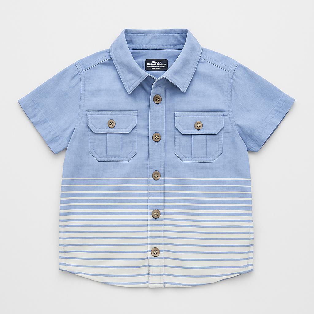 Questo adorabile shirt a maniche corte in tonalità azzurra è perfetto per i tuoi piccoli esploratori! Realizzato in una morbida cotone, presenta una vivace stampa a righe orizzontali che aggiunge un tocco di freschezza. Con due pratiche tasche sul petto e una chiusura frontale con bottoni, questo capo combina comodità e stile in un modo giocoso. Ideale per le avventure estive, picnic o giorni di gioco, anche se usato, risulta in ottime condizioni. Un pezzo versatile per il guardaroba estivo dei più piccoli!