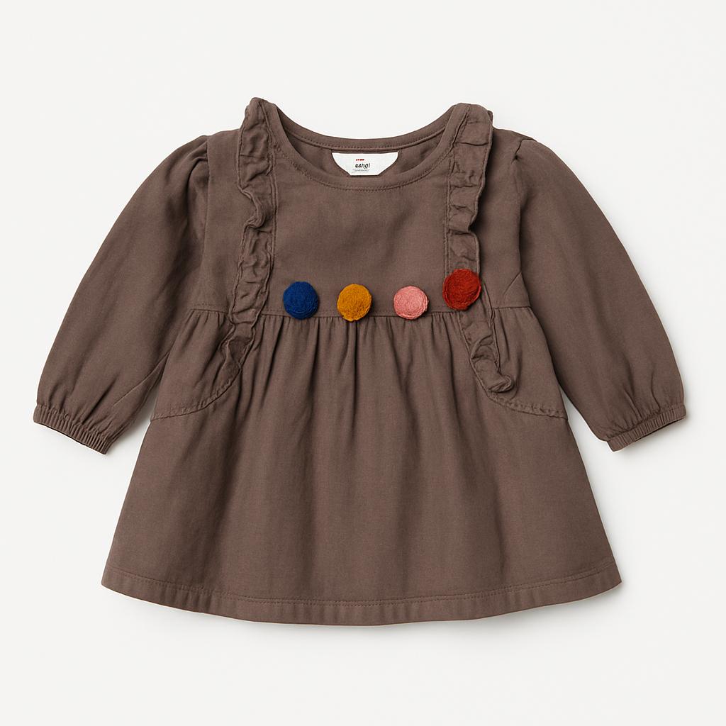 This adorable cotton blouse is perfect for little princesses! In a warm coffee color, it features delightful ruffles along the neck and sleeves, adding a touch of elegance. The colorful pom poms on the front add a playful and vibrant touch, making every outfit unique and fun. The long sleeves make it ideal for transitional seasons or cool evenings. Despite being a used item, it is in excellent condition and is ready to spark new memories with your little one! A true must-have for every wardrobe!