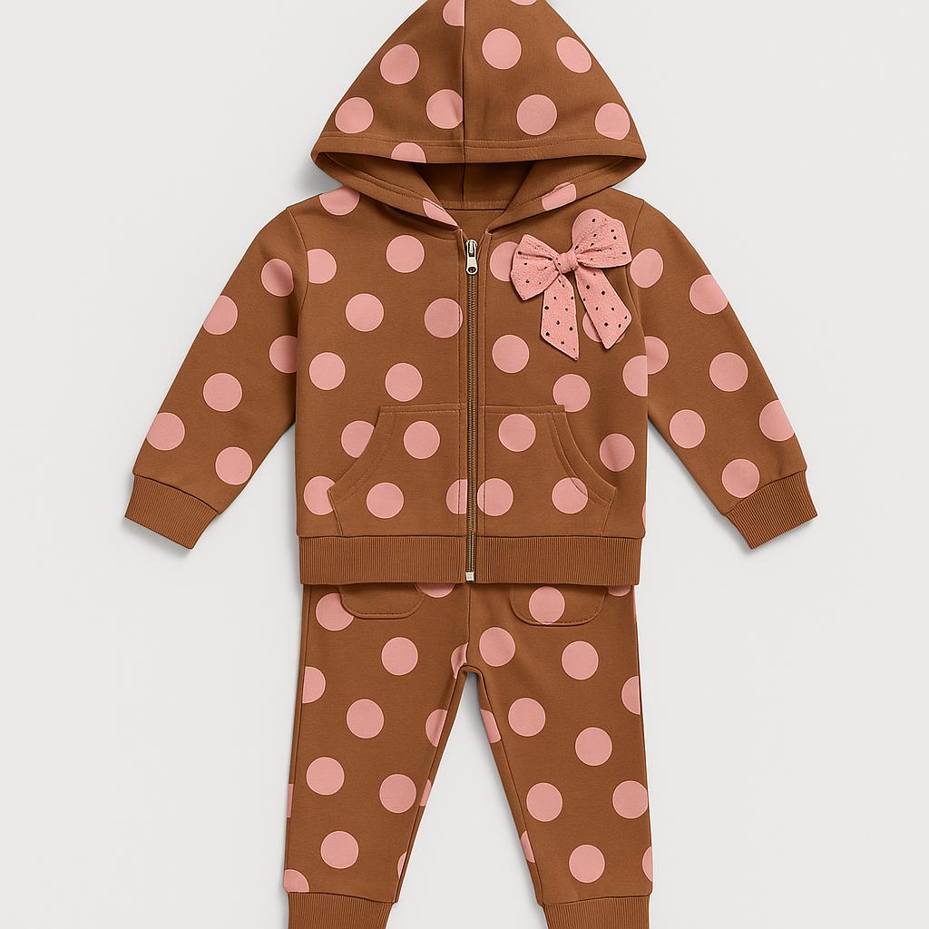 Questo adorabile completo con cappuccio è perfetto per le piccole fashioniste! Realizzato in morbido tessuto, presenta un delizioso motivo a pois rosa su uno sfondo marrone che aggiunge un tocco di dolcezza. Il delicato fiocchetto decorativo sul cappuccio porta un pizzico di charme, mentre la zip rende facile indossarlo. I pantaloni, con comode tasche, sono pensati per garantire libertà di movimento durante il gioco. Nonostante sia un capo usato, è in ottime condizioni e pronto a diventare il preferito nel guardaroba della tua bimba! Un outfit ideale per giornate all'insegna del divertimento e dello stile.