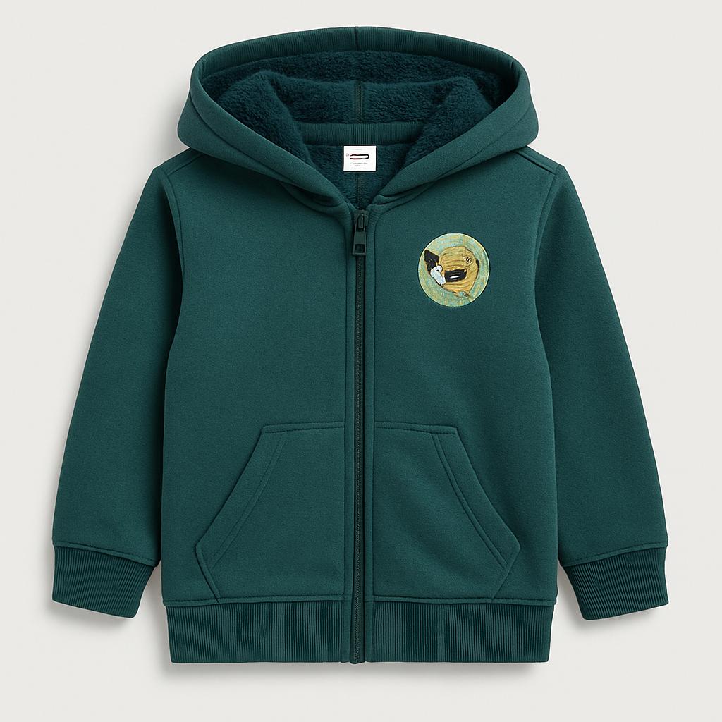 Questo adorabile felpa con cappuccio in un vivace verde oceano è perfetta per le avventure dei tuoi piccoli! Realizzata in un morbido tessuto fleece, offre calore e comfort. Il design è completato da una simpatica applicazione sul petto, che regala un tocco di allegria. Le pratiche tasche frontali sono ideali per riporre piccoli tesori. Questa felpa usata è in buone condizioni ed è l'alleata perfetta per le giornate fredde, garantendo uno stile accattivante senza rinunciare al comfort. Un capo immancabile nel guardaroba della tua bimba o del tuo bimbo!