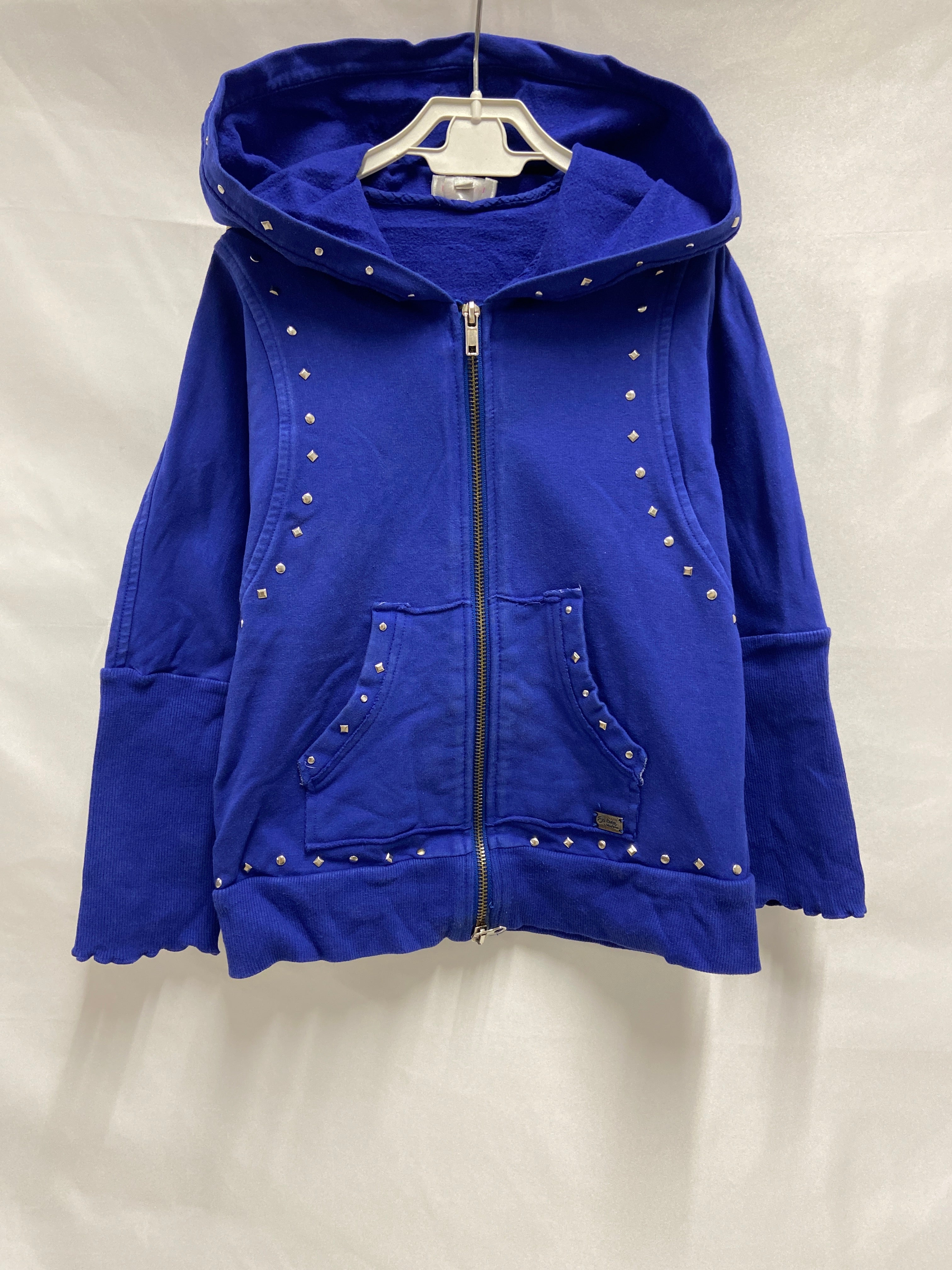 Questa giacca con zip di un vivace blu royal è un capo ideale per le piccole fashioniste! Realizzata in un morbidissimo cotone, è arricchita da deliziosi dettagli in strass che brillano con eleganza. Con il suo comodo cappuccio e le pratiche tasche, offre calore e stile in ogni occasione. Perfetta per le avventure all'aperto o per un look casual a scuola, questa giacca usata si presenta in ottime condizioni e sarà sicuramente un'aggiunta amata nel guardaroba della tua bimba!