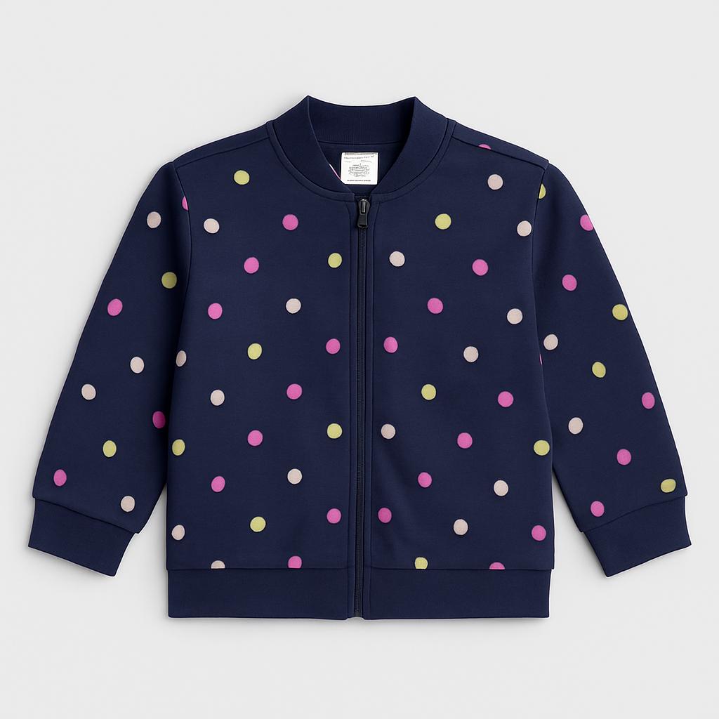 Questa adorabile giacca di colore blu scuro è perfetta per le piccole pesti che amano giocare! Decorata con vivaci pois multicolore, aggiunge un tocco di allegria e vivacità a qualsiasi outfit. La zip frontale facilita l'indossarla e toglierla, mentre il morbido tessuto in cotone garantisce comfort e calore durante le fresche giornate. Le maniche lunghe e il colletto rialzato la rendono ideale per arricchire i look autunnali. Nonostante sia un capo usato, si presenta in ottime condizioni e sarà un’aggiunta versatile e divertente al guardaroba della tua piccola!