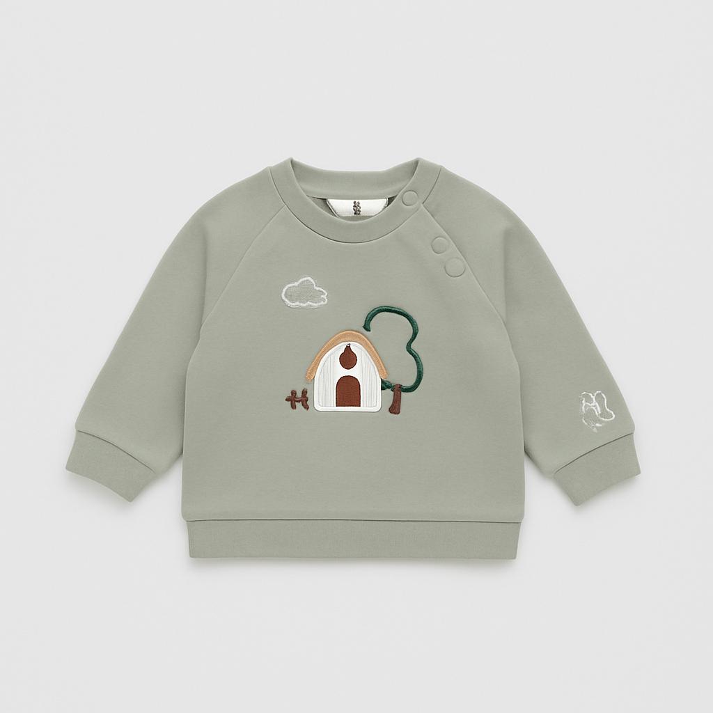 Questo dolce felpone in un delicato colore verde salvia è perfetto per le giornate fresche! Con un design adorabile che ritrae una casetta e un albero, porta un'atmosfera di avventure campestri. Le maniche lunghe e il taglio morbido assicurano comfort, mentre le pratiche aperture sui bottoni laterali facilitano la vestizione. Nonostante sia usato, si presenta in ottime condizioni, pronto ad accompagnare il tuo piccolo in ogni gioco e scoperta. Un capo essenziale per un look casual e alla moda!