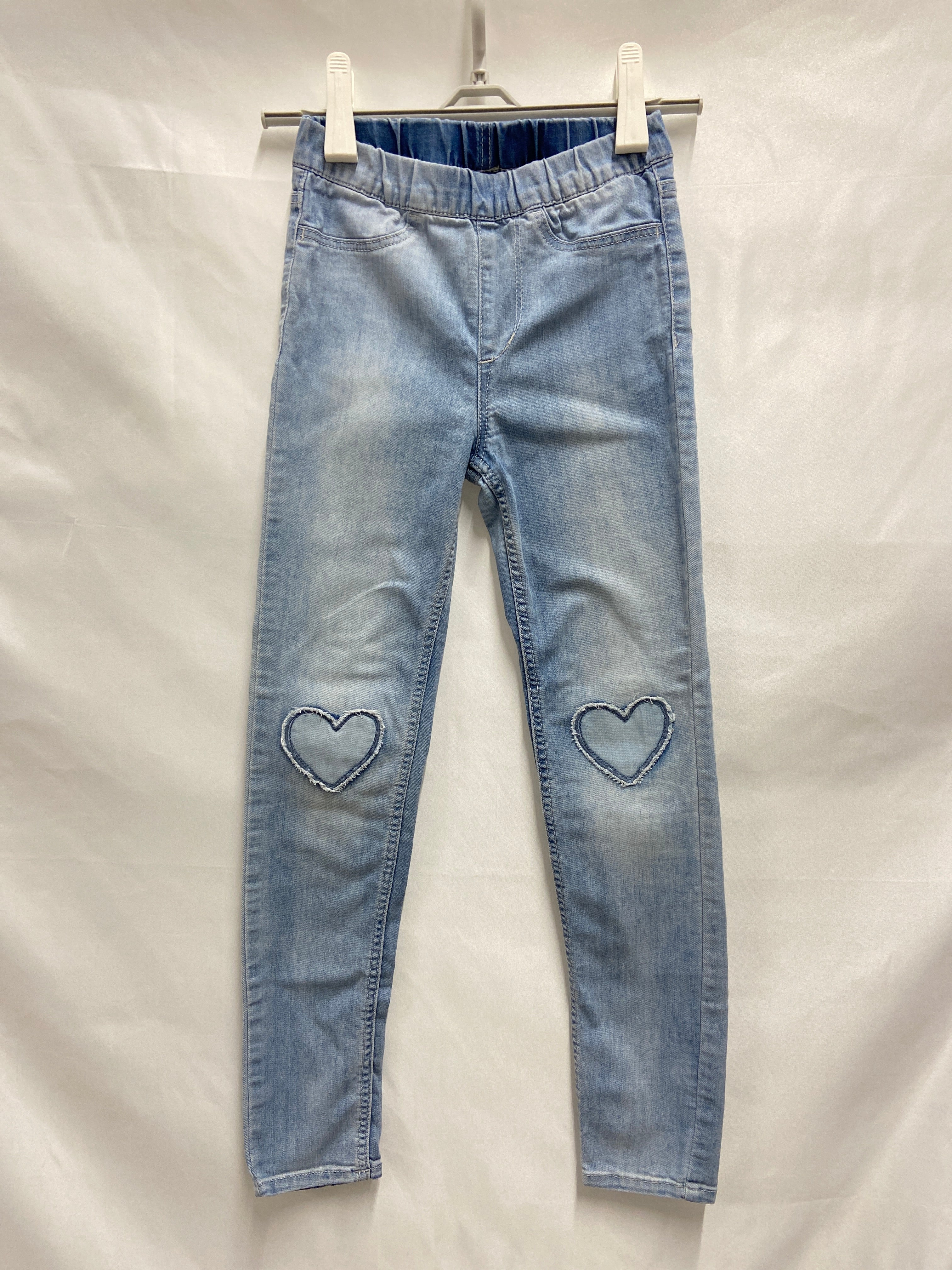 Questi adorabili leggings in denim blu chiaro sono un'aggiunta perfetta per il guardaroba delle piccole fashioniste! Con un comodo elastico in vita, garantiscono libertà di movimento per giocare e divertirsi. Le simpatiche applicazioni a forma di cuore sui ginocchi donano un tocco giocoso e alla moda. Nonostante siano usati, si presentano in ottime condizioni, pronti per essere indossati in ogni occasione. Ideali per abbinare a t-shirt colorate o maglioni morbidi, questi leggings uniscono stile e comfort, rendendoli un capo irrinunciabile!