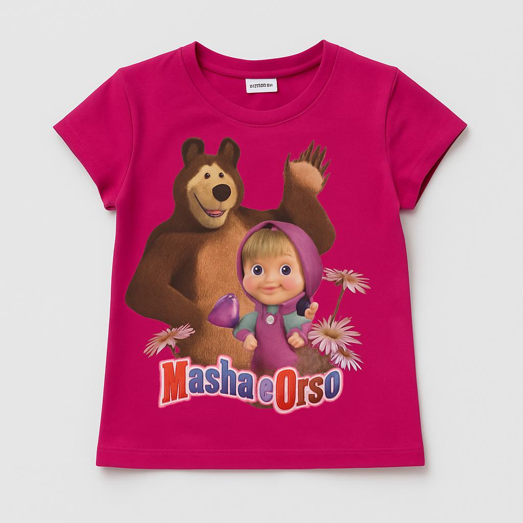 Questa adorabile t-shirt di Masha e Orso è perfetta per le piccole fan dell'amatissima serie! Realizzata in morbido cotone fucsia, la maglietta presenta un vivace disegno con Masha e il suo amico orso, che cattureranno sicuramente l'attenzione. Il taglio comodo e le maniche corte la rendono ideale per le giornate estive, giochi all'aperto o semplicemente per un look giocoso. Nonostante sia un capo usato, si presenta in ottime condizioni, pronta a portare un sorriso sul volto di ogni bimba che la indosserà! Un'opzione colorata e divertente da aggiungere al guardaroba!