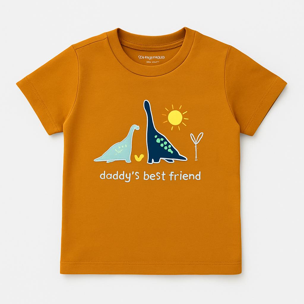 Questa adorabile t-shirt arancione è perfetta per i piccoli esploratori! Decorata con due simpatici dinosauri e la scritta "daddy's best friend", aggiunge un tocco di allegria e tenerezza al guardaroba. Realizzata in un cotone morbido e traspirante, è ideale per le avventure di ogni giorno. Le maniche corte garantiscono comfort nelle giornate calde e il colore vivace la rende facilmente abbinabile a shorts o jeans. Pur essendo un capo usato, si presenta in ottime condizioni, pronto per accompagnare il tuo bambino in ogni divertente avventura!