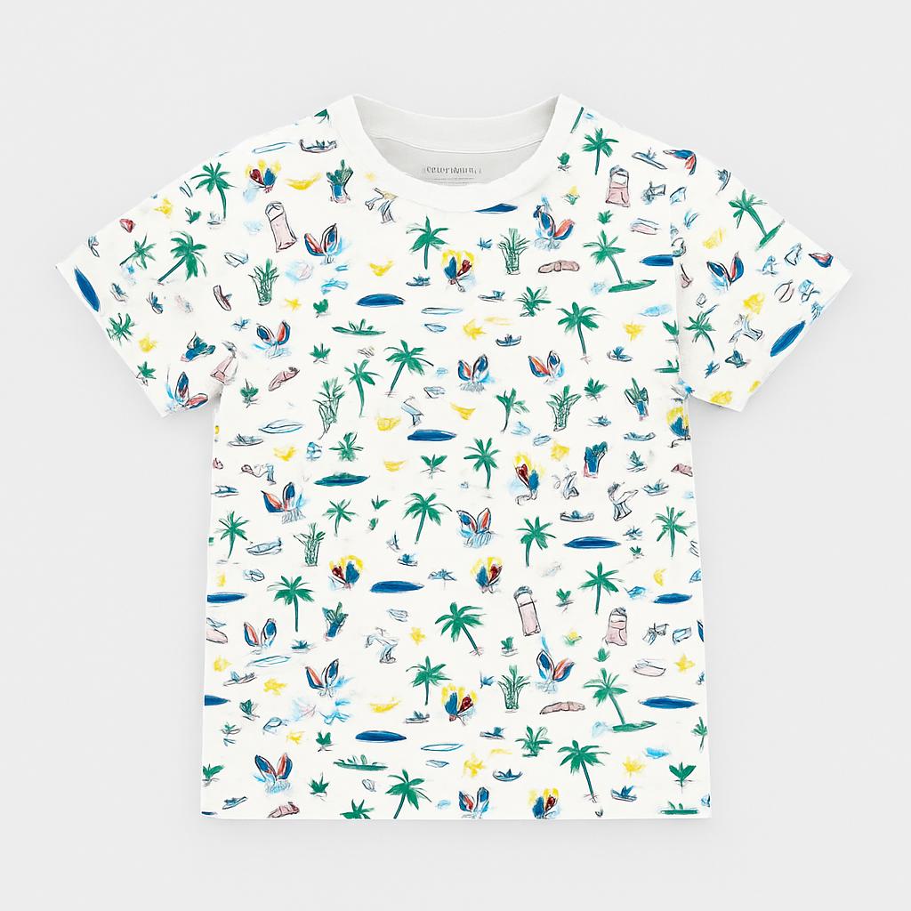 Questa allegra t-shirt è perfetta per i piccoli esploratori! Realizzata in morbido cotone, presenta una vivace stampa estiva con sole, palme e surf. I colori brillanti e i divertenti motivi la rendono ideale per ogni avventura, sia al mare che in giardino. Il taglio comodo e le maniche corte assicurano freschezza e libertà di movimento. Nonostante sia usata, la t-shirt è in ottime condizioni e porterà sicuramente un sorriso sul volto del tuo bambino! Un capo essenziale per un look spensierato e trendy!
