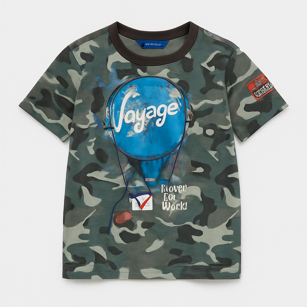 Questa originale t-shirt di marca PULL&BEAR è perfetta per i piccoli esploratori! Realizzata in morbido cotone, il suo motivo camouflage è arricchito da una colorata grafica di un pallone aerostatico. Con la scritta “Voyage” che invita a viaggiare nel mondo, questa maglietta è un invito all'avventura! Le maniche corte e il taglio rilassato la rendono ideale per ogni occasione, sia per un pomeriggio di giochi che per un'uscita con amici. Anche se usata, si presenta in eccellenti condizioni, pronta a far brillare il guardaroba dei tuoi bambini! Un must-have per ogni piccolo viaggiatore!