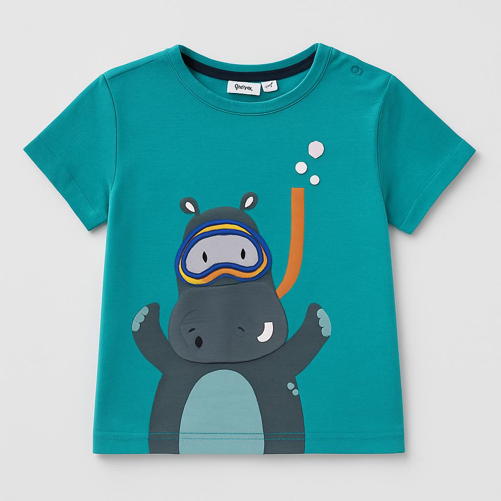 Questa simpatica t-shirt azzurra è perfetta per i piccoli avventurieri! Realizzata in morbido cotone, presenta un adorabile ippopotamo subacqueo che indossa occhialini da snorkeling. I colori vivaci e il design giocoso cattureranno l'attenzione di tutti. Le maniche corte e il taglio confortevole la rendono ideale per le giornate estive, giochi nel parco o semplici momenti di svago. Sebbene sia un capo usato, è in ottime condizioni e pronto per essere indossato da un piccolo esploratore! Un'ottima scelta per chi desidera un look divertente e alla moda.