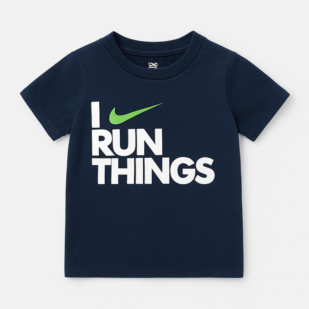 Questa simpatica t-shirt Nike farà sicuramente divertire il tuo piccolo atleta! Realizzata in morbido cotone, il suo elegante colore blu navy è adorabile e versatile. Sul fronte si distingue una scritta audace "I RUN THINGS" in bianco e verde, perfetta per chi ama giocare e muoversi con stile. Le maniche corte e il taglio pratico garantiscono comfort durante le avventure giornaliere. Nonostante sia un capo usato, è in ottime condizioni e pronta per essere indossata con orgoglio! Un'ottima scelta per i piccoli che amano correre e divertirsi!