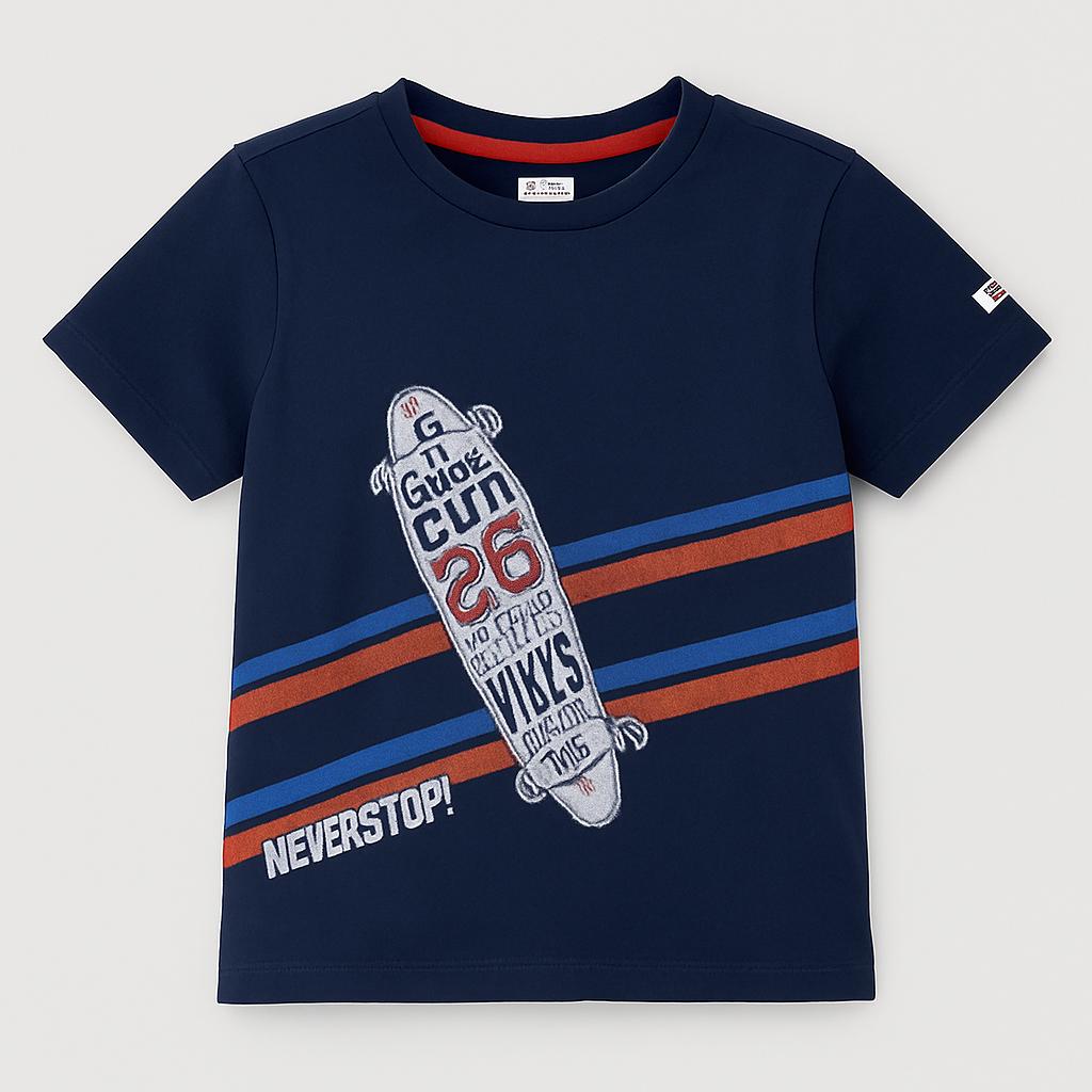 Questa dinamica t-shirt di marca GIT è un'ottima aggiunta al guardaroba del tuo piccolo skater! Realizzata in morbido cotone, presenta un elegante fondo blu scuro, decorato da strisce rosse e bianche che evidenziano il design audace. Sul fronte, un iconico skateboard insieme alla scritta “NEVER STOP!” sprigiona un'energia vivace e avventurosa.