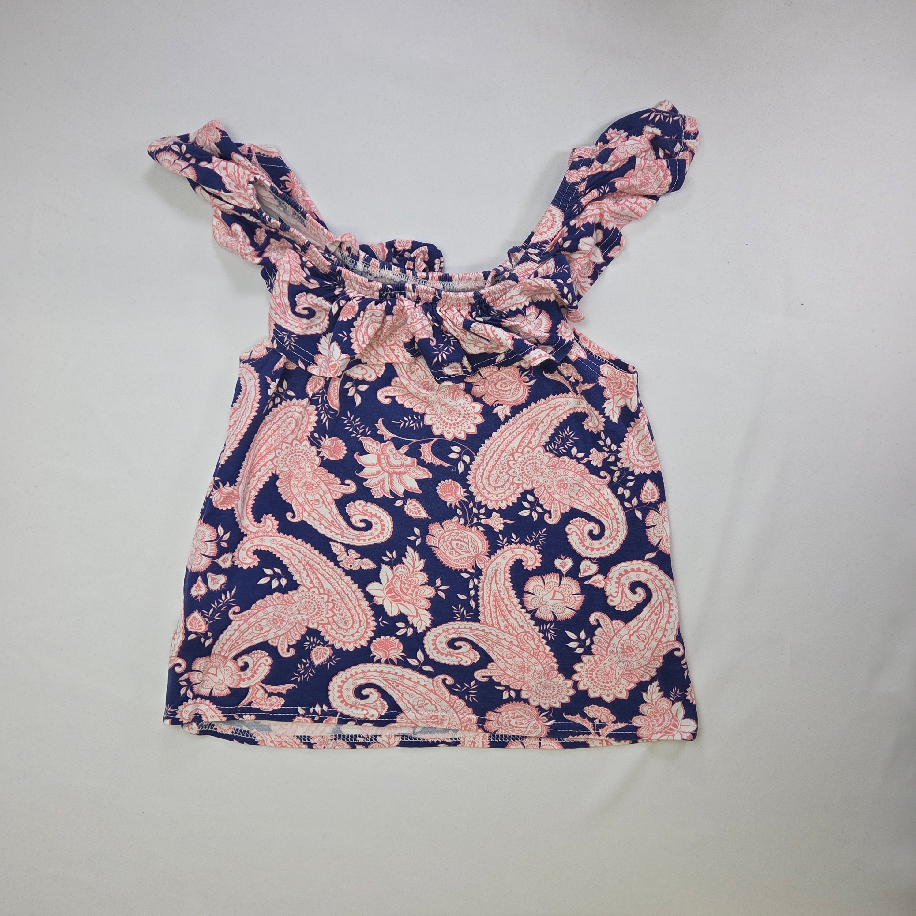 Questo incantevole top floreale è perfetto per le piccole sognatrici! Realizzato in tessuto leggero e morbido, presenta una deliziosa fantasia a paisley in tonalità di blu navy e pesca. Le spalline svolazzanti aggiungono un tocco di eleganza, rendendo questo capo ideale per giornate estive al parco o festicciole tra amici. Nonostante sia usato, è in ottime condizioni e pronto a dare un tocco di stile al guardaroba della tua bambina. Un must-have per chi ama sentirsi unica e alla moda!