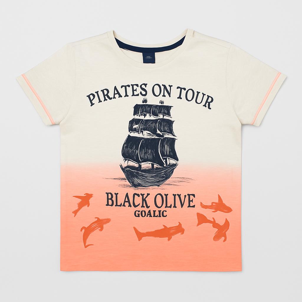 Preparati a salpare verso avventure mozzafiato con questa t-shirt di Black Olive! Il suo design vivace presenta una nave pirata in bella mostra, accompagnata dalla scritta "PIRATES ON TOUR" che stimola l'immaginazione. La base bianca sfuma in un allegro arancione, rendendola perfetta per abbinamenti estivi. Realizzata in morbido cotone, è comoda e leggera, ideale per i giochi e le esplorazioni all'aperto. Nonostante sia un capo usato, si presenta in ottime condizioni e aggiunge un tocco di avventura al guardaroba del tuo piccolo!
